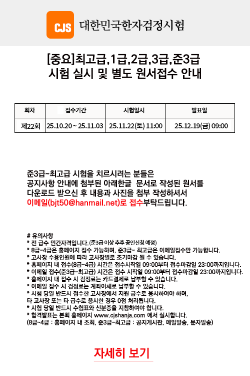 대한민국한자검정시험을 사랑해 주시는 여러분, 제22회 시험 접수가 시작되었습니다.(접수기간 : 2025년 10월 20일(월)~11월 3일(월)) 이번에도 많은 관심 가져주시기 바랍니다.